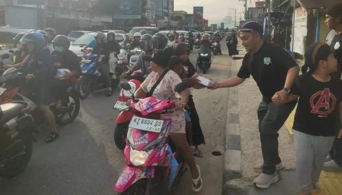 Satu-persatu masyarakat yang melintasi Jalan Pangeran Antasari baik dengan kendaraan roda dua dan roda empat, secara simpatik dihentikan sejenak untuk diberikan takjil ramadan.
